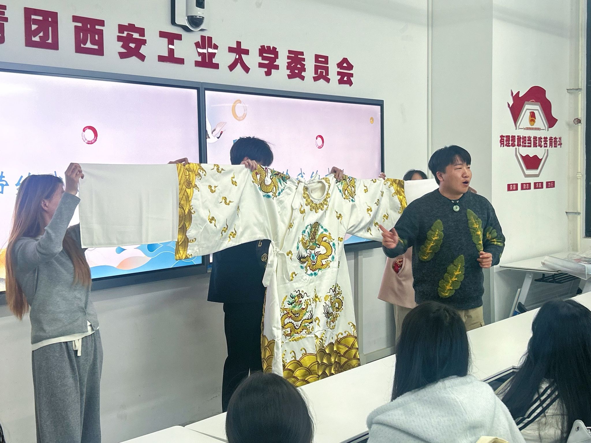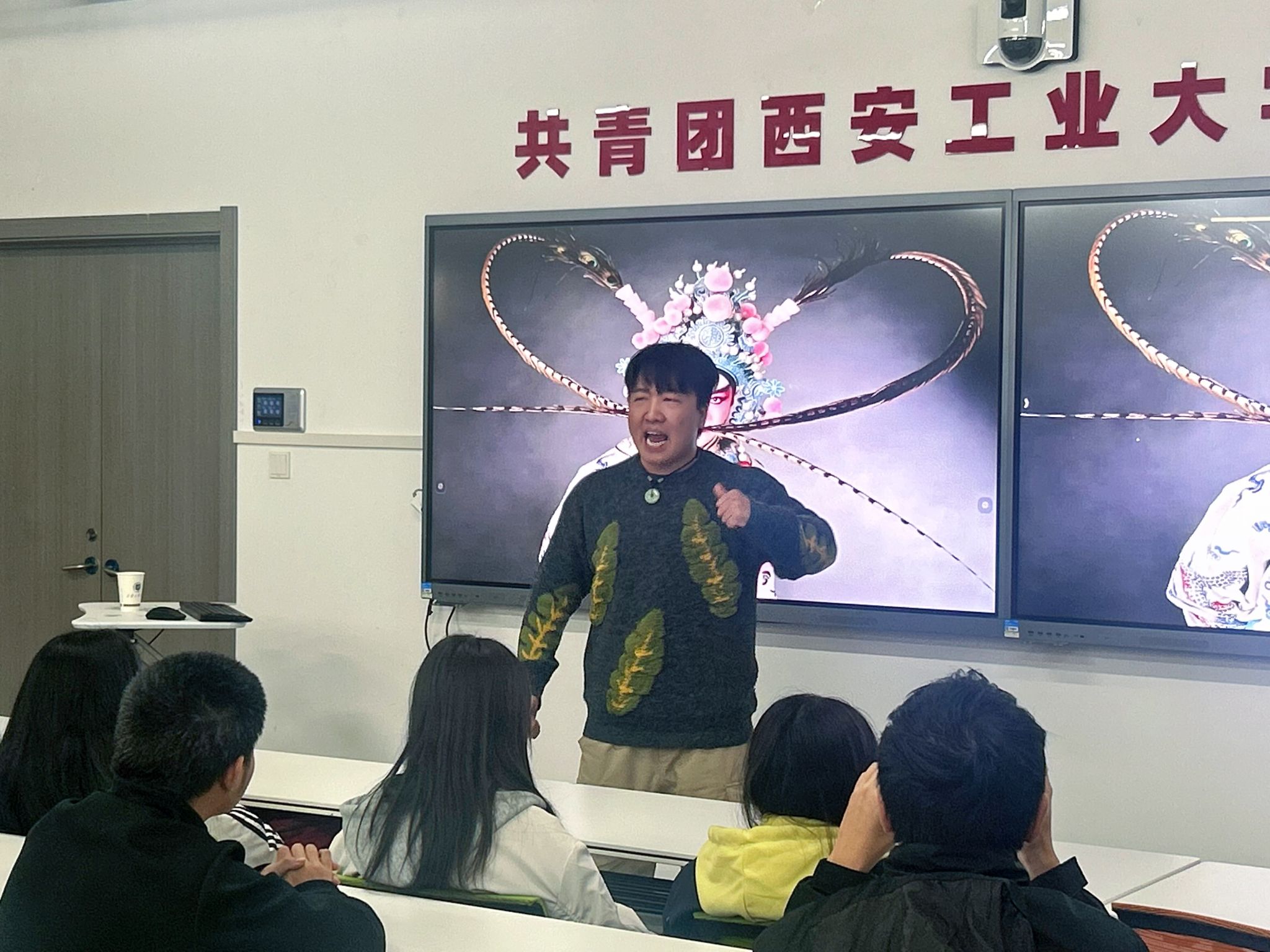 魏彦磊同学分享了他在豫剧传承过程中探寻热爱的经历,详细讲述了自身与戏曲的深厚渊源:作为土生土长的河南汝州人,豫剧独特的唱腔与韵味在他心中留下了极为深刻的印象。他向同学们深入剖析了豫剧与曲剧的独特魅力,分享了自己曾参与的戏曲剧目,现场为同学们演绎了一段慷慨激昂的《黄鹤楼》,并展示了两套精美绝伦的戏曲传统服饰。