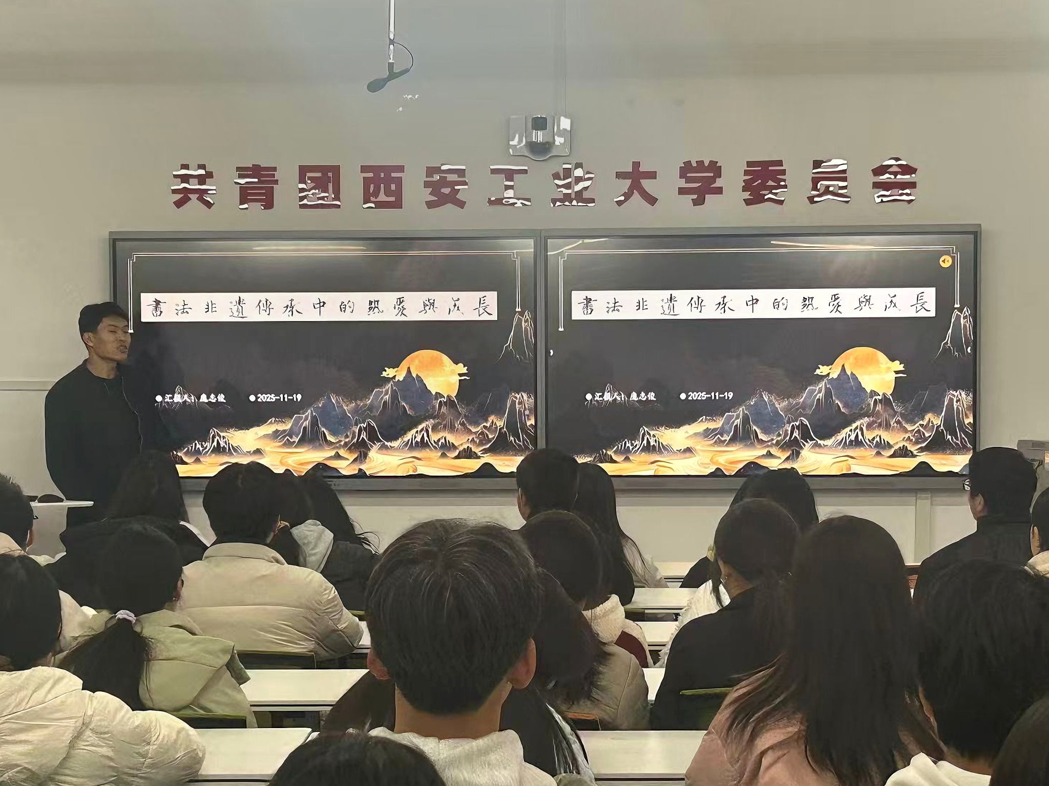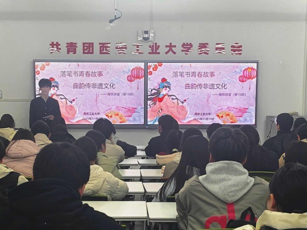 2025年11月19日,第十六期“青样讲堂”于大学生活动中心301顺利举办。本期“青样讲堂”以“落笔书青春故事,曲韵传非遗文化”为主题,特邀中国书法学院的庞志俊同学与魏彦磊同学,围绕书法与豫剧的非物质文化遗产传承展开分享。六十余名同学参与了此次活动。