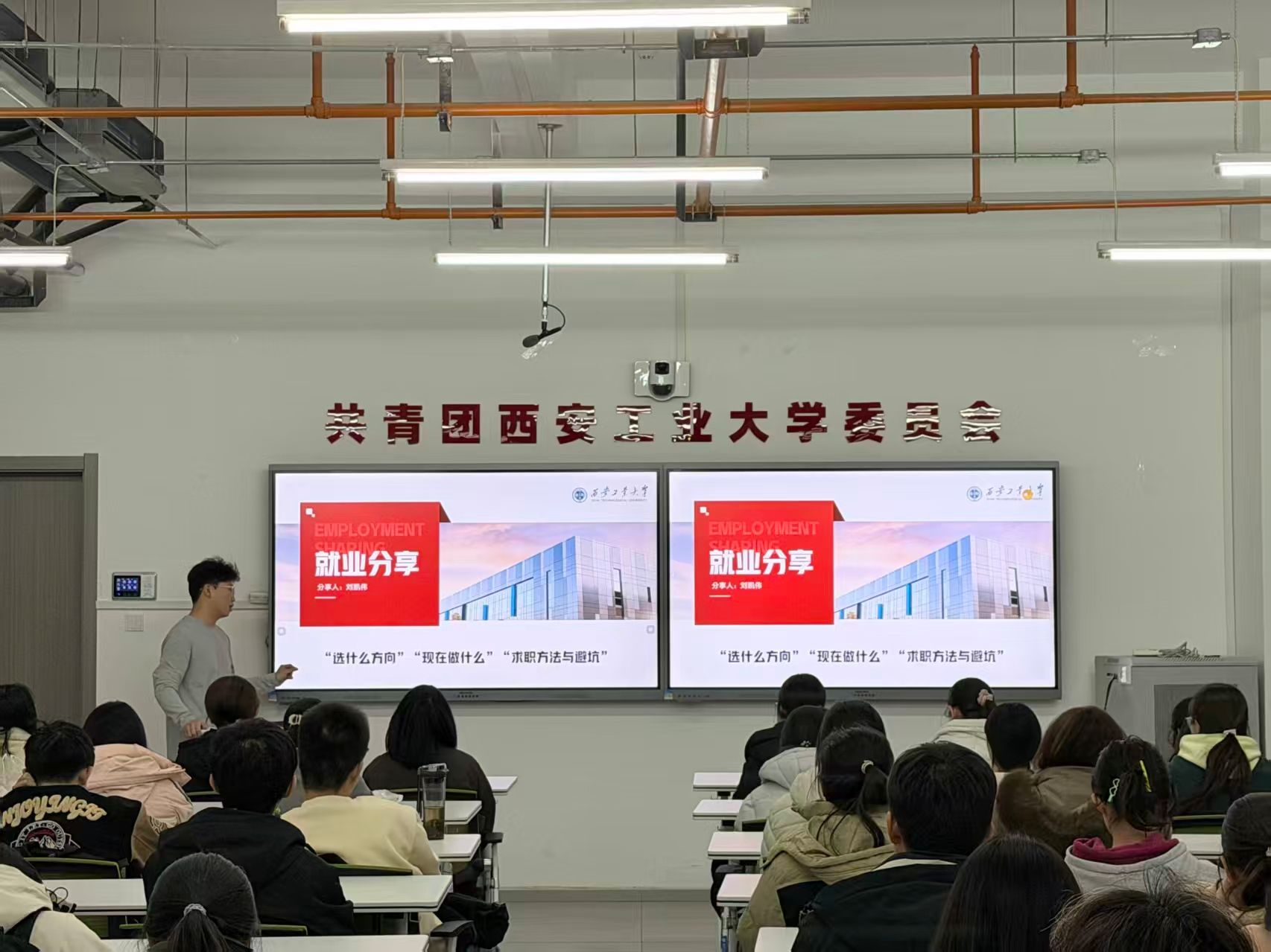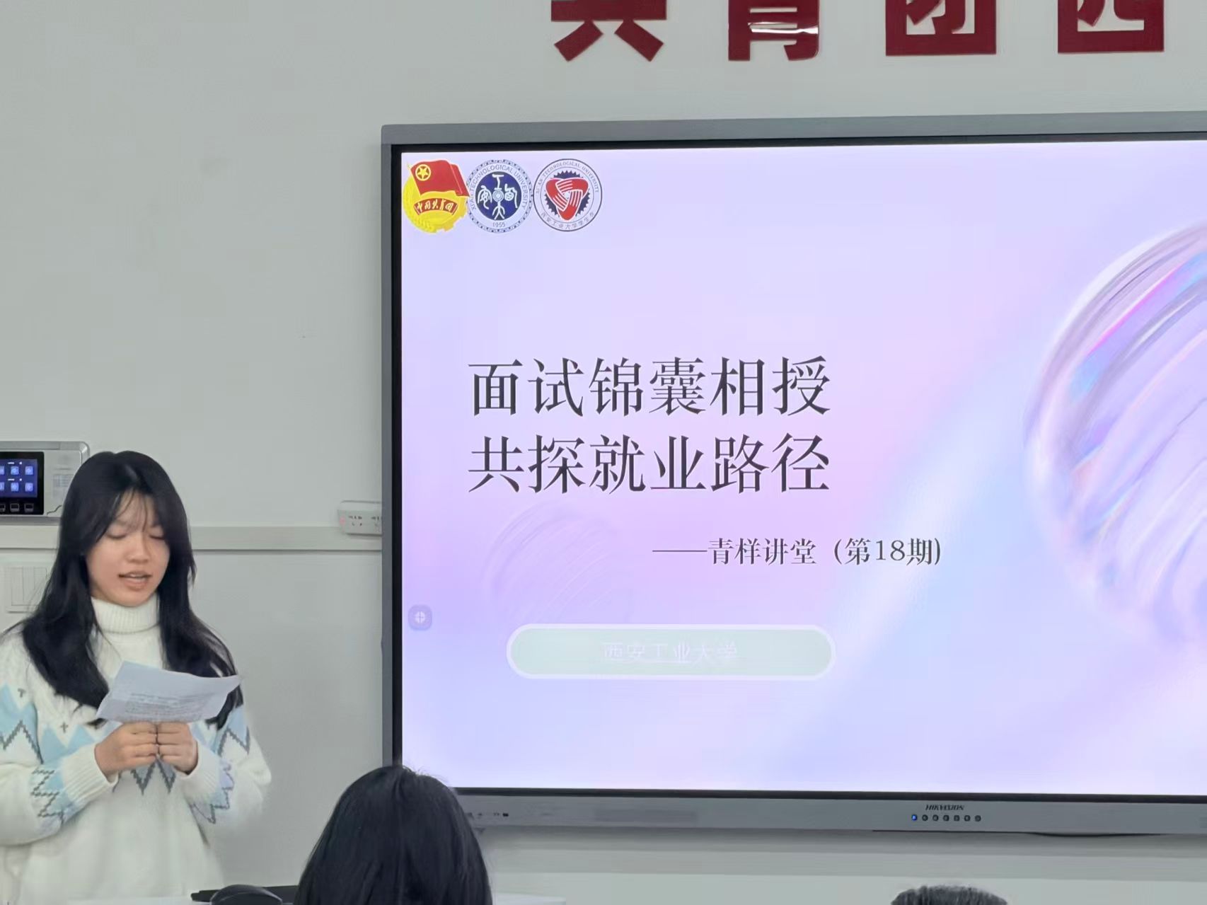 2025年12月10日,第十八期“青样讲堂”在大学生活动中心301成功举办,本期“青样讲堂”以“面试锦囊相授,共探就业路径”为主题,邀请到了刘凯伟同学和黄小艳同学为同学们进行面试经验和实习经历方面的分享,60余名同学参加了本次活动。