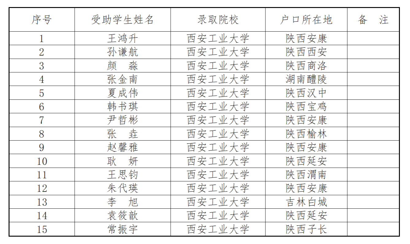 根据《陕西省青少年发展基金会关于做好2025年度“爱心100“助学行动工作的通知》与学生资助管理规则,通过学生本人申请、院系审核及学校评议,确定15人受助,现将资助学生名单公布如下:
